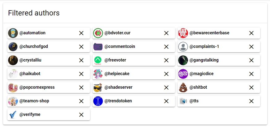 This will display the list of all authors you have filtered. To remove an account from the list you want to reappear in your Inbox, simply click on the "x" on the right of its name.