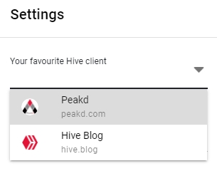 hive.blog is the default client but you’re of course free to choose another one. If your favorite client is missing from the list, feel free to contact me to add it.