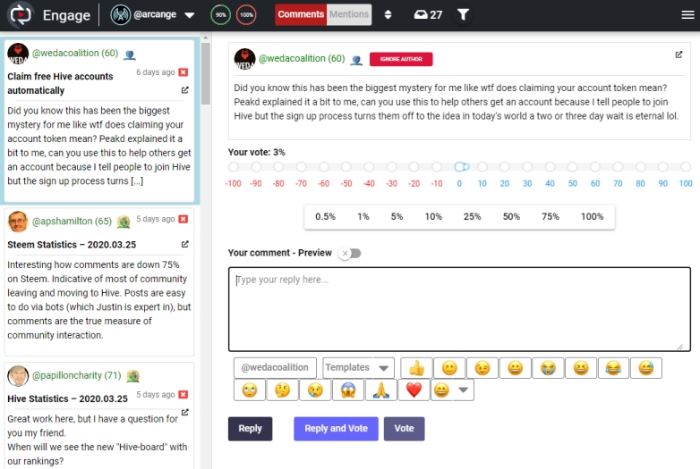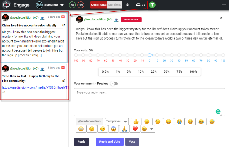 You can do whatever you want with those comments (reply, vote, ignore, …) and when all the comments will be processed, Engage will keep the Author Filter feature activated and go to the next author waiting in your inbox (in my example it will be @edmundocentenor) and display all its comments.